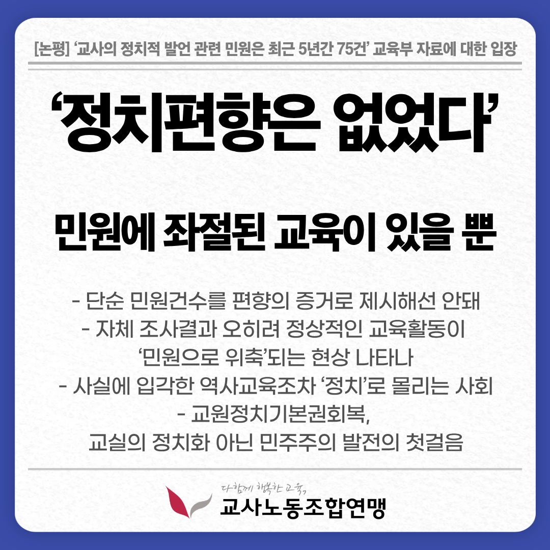 ‘교사의 정치적 발언 관련 민원은 최근 5년간 75건’ 교육부 자료에 대한 교사노동조합연맹의 입장
